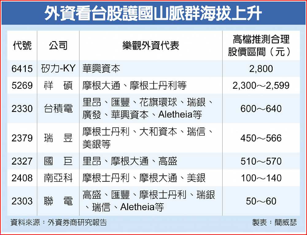 在國際熱錢之外,外資研究機構力挺台股護國山脈群拉上新高度,居功厥偉。首先,最大權值股台積電股價躍上500元等級、刷新歷史紀錄之際,外資看台積電目標價早就往600元俱樂部集結,包括:里昂、匯豐、花旗環球、瑞銀、廣發、華興資本,以及研究機構Aletheia等,都賦予600元以上推測合理股價,是外資看台股升級趨勢最具代表性個股。
