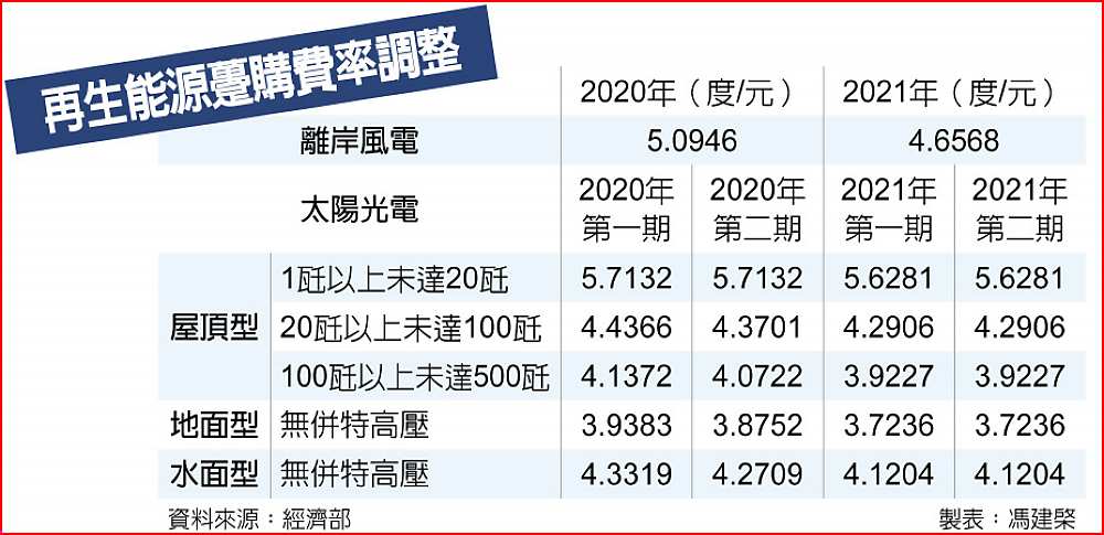 而改變最大是離岸風電20年躉購費率首次跌破每度5元,109年度再生能源發電設備電能躉購費率當中,離岸風電的固定20年躉購費率,今年還有每度5.0946元,明年將調降至每度4.6568元。只要是今年12月31日前完成簽約風場,都還可享受每度5元以上,明年起才完成簽約風場,價格則跌破5元。