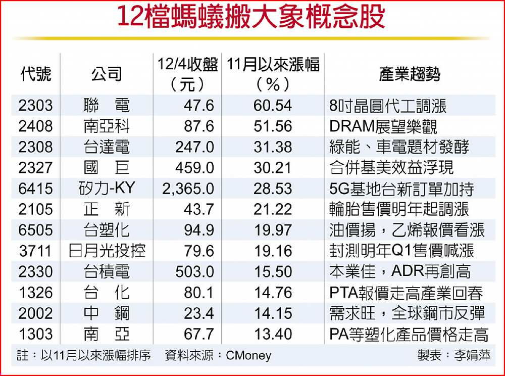 除聯電外,記憶體大廠南亞科、電供大廠台達電、被動元件龍頭廠國巨、股后矽力-KY、國內輪胎龍頭廠正新,11月以來股價漲幅也在二成以上,台塑化、日月光投控、台積電、台化、中鋼及南亞,11月來漲幅皆逾一成。