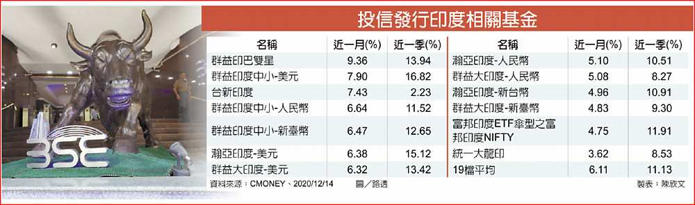 全球股市近期表現高檔震盪,14日印度股市逆勢上揚再創歷史新高,統計今年來已創新高15次,也使得今年來指數報酬上漲12.15%。觀察投信發行19檔印度相關基金,近一月、近一季全數正報酬,整體平均漲幅分別為6.11%、11.13%表現亮麗。市場法人表示,疫情趨緩加上印度經濟數據持續回升,中長期都具投資優勢,建議投資人可留意印度基金投資契機。