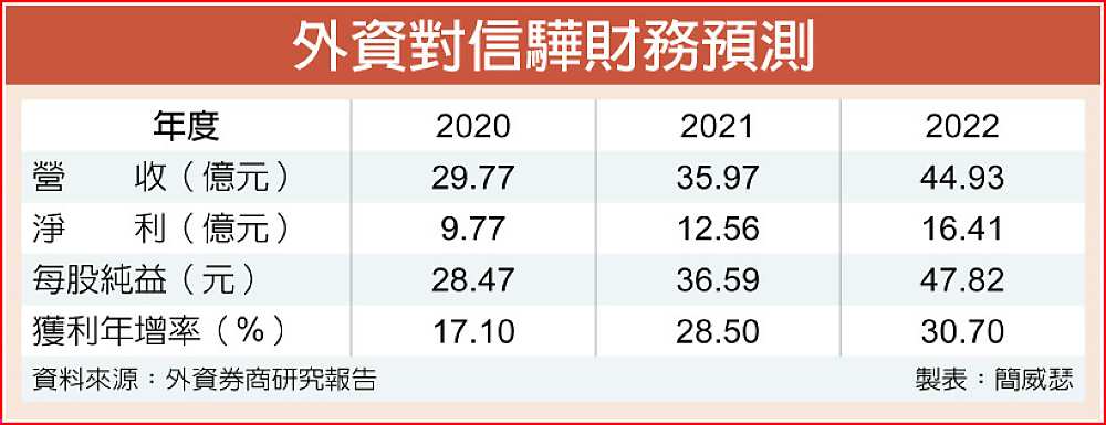 從股價表現來看,信驊股價近期雖有上漲,但里昂認為其評價目前不過與台股整體市場相當,若比起其他雲端零組件同業,還是相對落後;外資估計,信驊2020~2022年每股純益分別是28.47元、36.59元與47.82元,未來二至三年的每股純益年複合成長率,與過去十年的30%左右不相上下,尚有進一步獲得重新評價(rerate)空間。