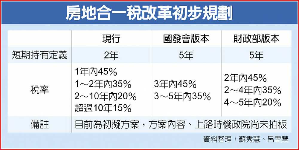 據了解,為讓房地合一稅發揮抑制炒房威力,短期持有定義將更嚴苛,由現行二年拉長為五年,財政部及國發會各提版本,其中財政部初版個人持有期間二年內交易稅率為交易利得的45%;持有期間二~四年內稅率為交易利得的35%;四~五年內稅率則是交易利得的20%。