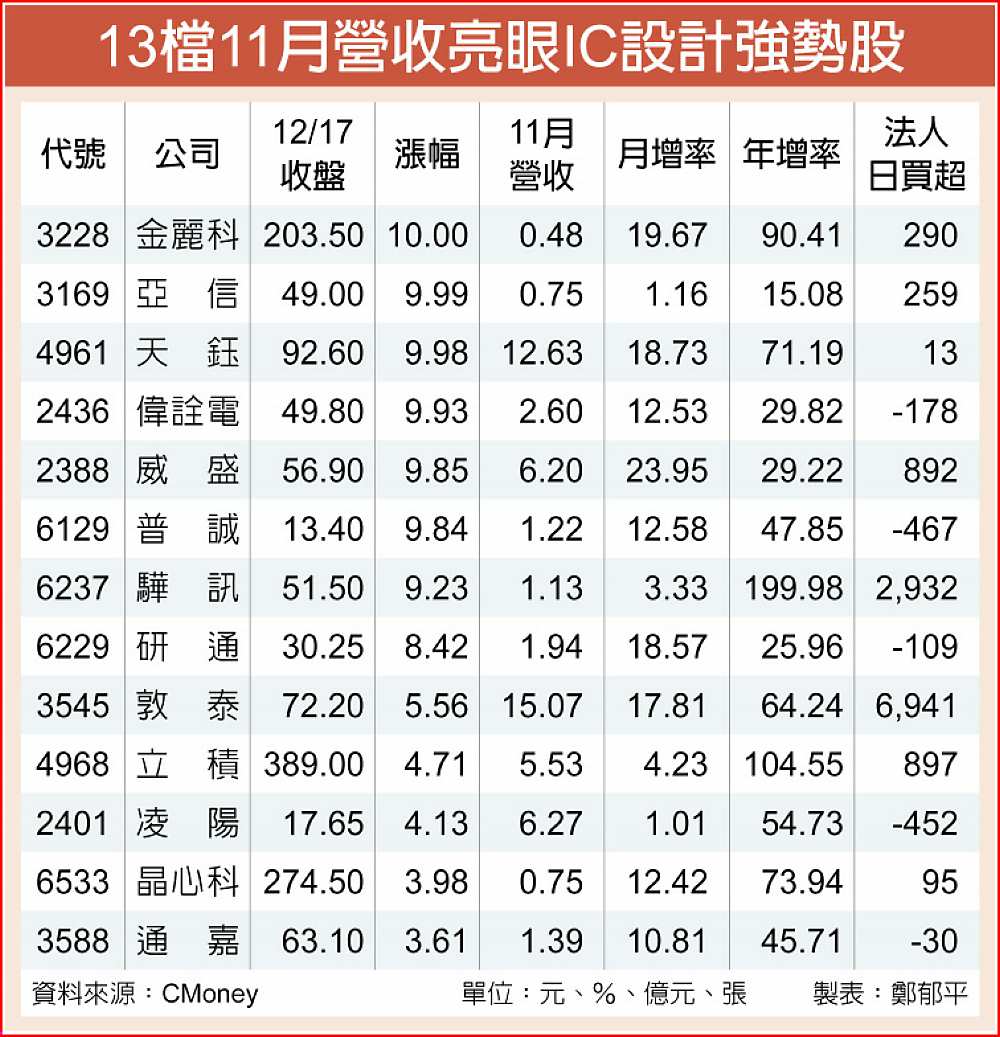 操作方面,廖祿民建議,部分IC設計高價股因過去漲多,股價近期無法突破前高壓力;反觀部分中低價位個股,11月營收紛紛創高,基本面逐漸跟上股價成長腳步,隨產業結構轉佳,為投資人可留意之標的。