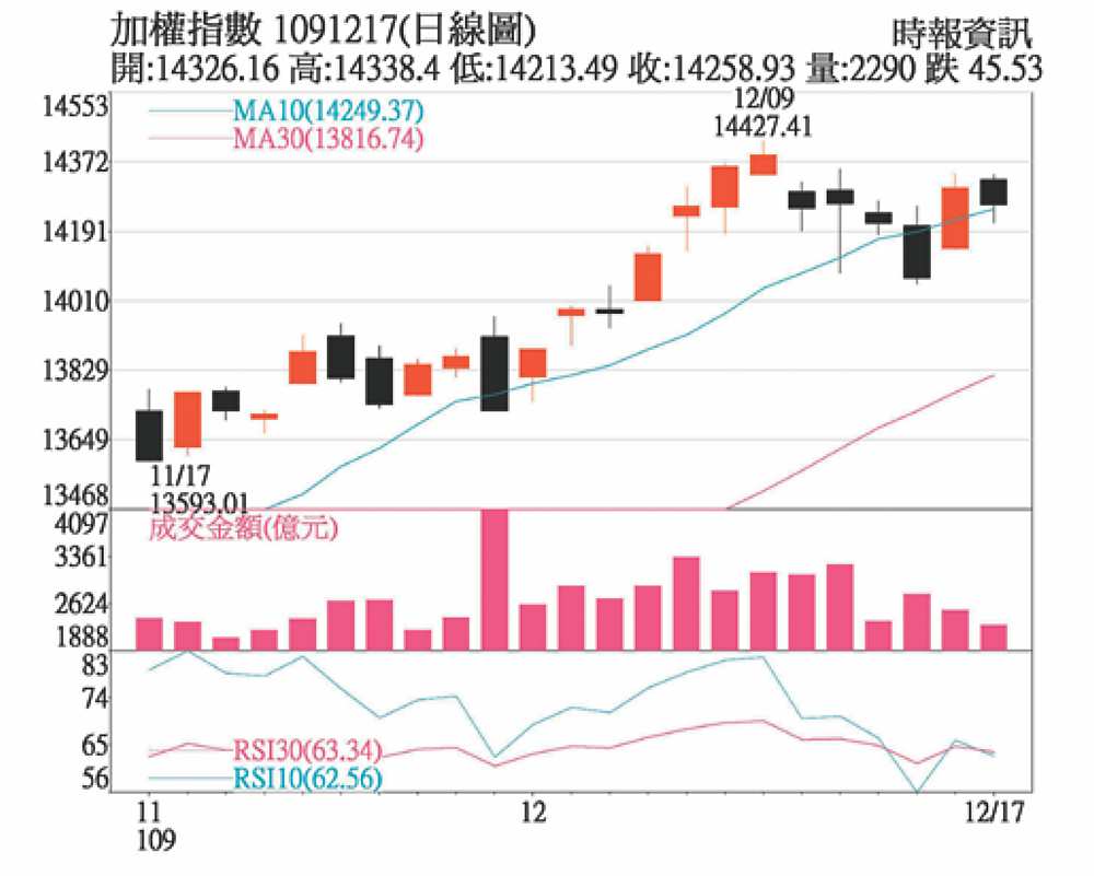 近期外資在期貨未平倉部位轉空,配合過往聖誕長假效應,外資買盤短期較難歸隊,加上勞動基金事件尚未明朗,本土資金信心不足;但歐美衛生部門陸續批准疫苗使用、及美國新一輪財政刺激持續進展,科技股指標那斯達克指數已領先過高,台股雖然波動加劇,但風險應屬可控。