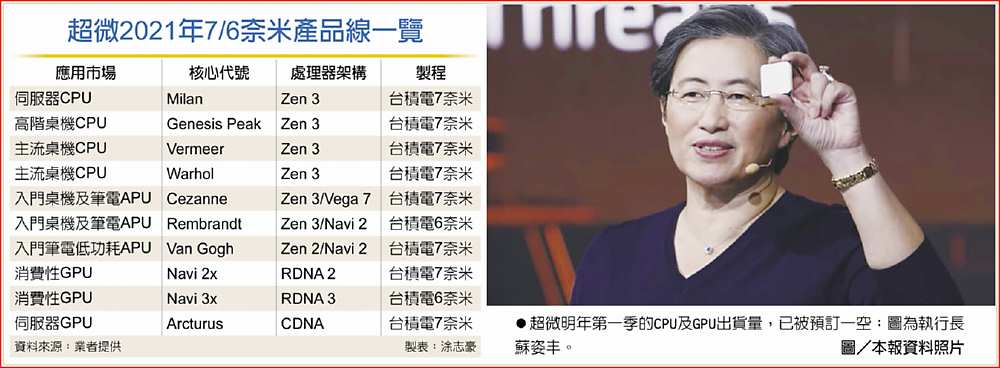 受惠於新冠肺炎疫情帶動個人電腦及遊戲機強勁銷售動能,處理器大廠美商超微(AMD)明年第一季的中央處理器(CPU)及繪圖處理器(GPU)出貨量已被ODM/OEM廠預訂一空,並持續追加在台積電7奈米投片量。超微攜手台積電大搶市占率,業界預算超微明年在台積電7奈米投片量將較今年增加逾八成,並擠下高通成為台積電7奈米製程最大客戶。