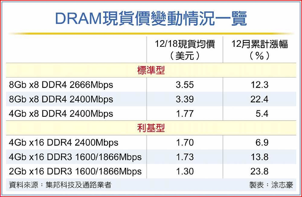 根據集邦科技及通路商資料,12月以來標準型及利基型DRAM現貨價漲勢強勁。在標準型DRAM部份,8Gb DDR4 2666Mbps現貨均價18日漲至3.55美元,12月來累計漲幅達12.3%;8Gb DDR4 2400Mbps現貨均價漲至3.39美元,12月來累計漲幅達22.4%。主要漲升動能來自於筆電及桌機等DRAM模組升級需求,以及市場預期明年上半年將供不應求而提前備貨。