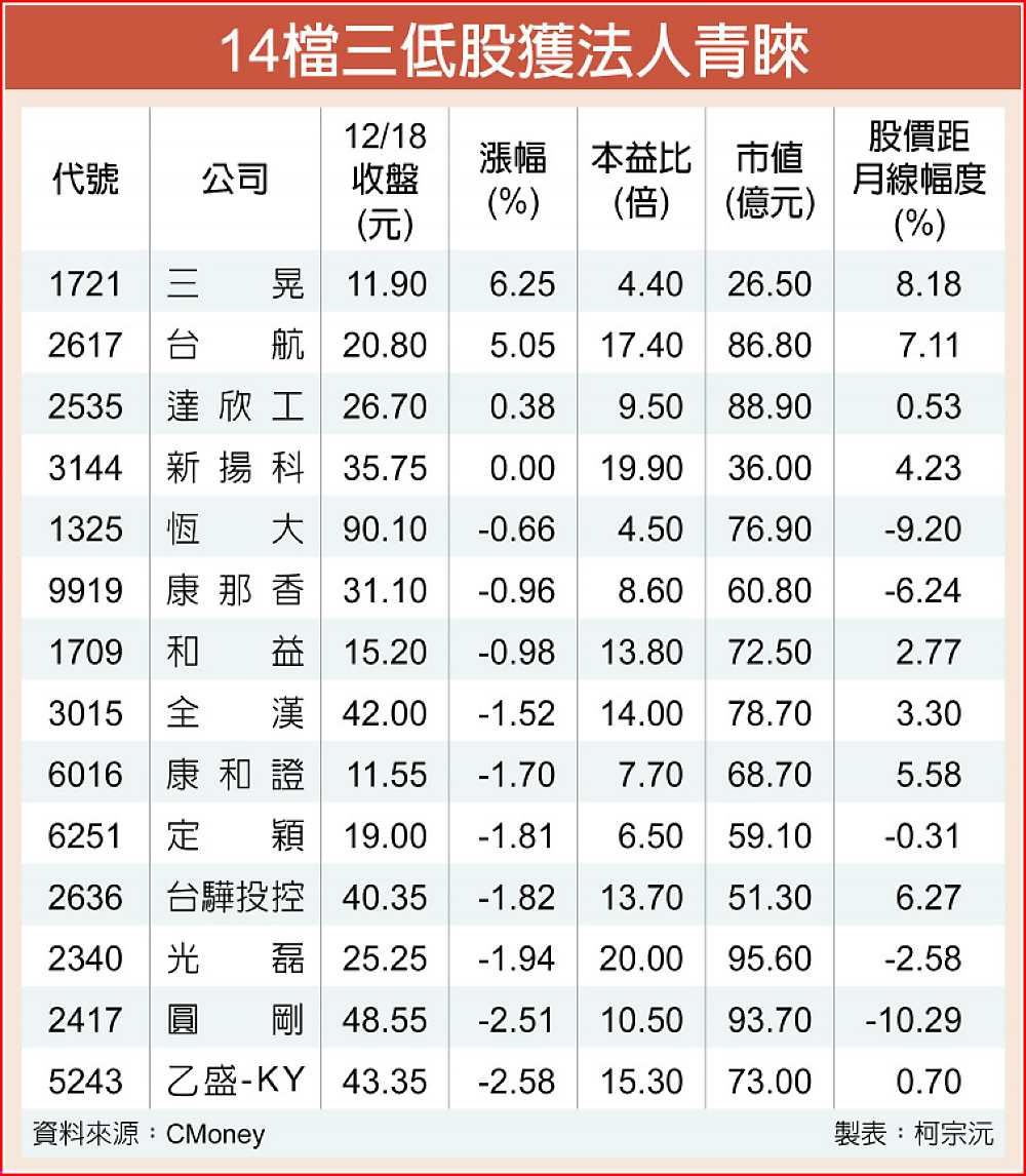 內資掌控多頭兵符,次族群氣勢勝過大盤,包括台航(2617)、三晃(1721)、台驊投控(2636)等14檔低基期、低市值、低股價的三低股成為法人年底短線操作選擇,若能搭配個股題材助燃,有望成為大盤高檔震盪期間的資金避風港。