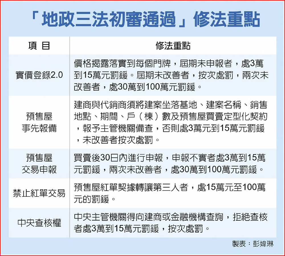 立院內政委員會21日通過實價登錄2.0的地政三法,讓交易價格揭露到每個門牌,且預售屋也要在買賣後30日內揭露。同時,立法院畢其功於一役,將紅單交易納管,禁止紅單交易,若將預購紅單轉售給第三人,可處15萬到100萬罰鍰。
