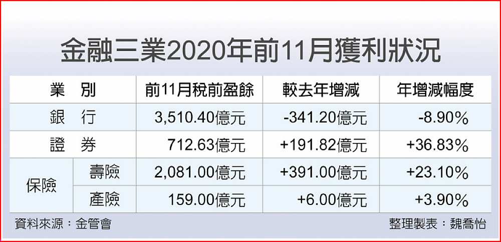 據金管會各局統計,銀行業前11月賺3,510.4億元,較去年同期衰退幅度從2020年上半年的12%縮小為8.9%;證券期貨投信投顧業前11月獲利712.63億元、年增36.83%;保險業前11月則賺2,240億元,年增21.5%。