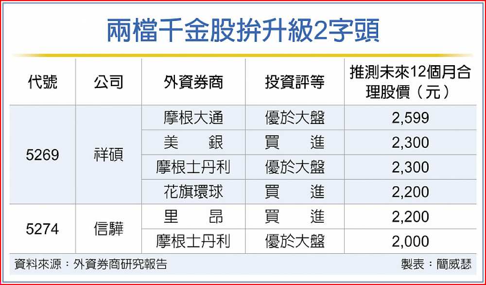外資歸隊開啟台股多頭新劇本,瞄準千金族群。美銀證券初評祥碩,給予「買進」投資評等與2,300元推測合理股價,僅次摩根大通的2,599元;摩根士丹利證券則升信驊至2,000元,亦僅次里昂的2,200元,兩檔千金升級「2」字頭來勢洶洶,達陣將創台股新紀錄。