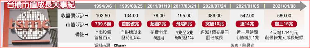 對照台積電今年初市值甫見到14兆元大關,此次更僅花四個交易日就突破15兆元,改寫兆元增長最速紀錄,統計單周市值「增胖」達1.29兆元,創下開春好采頭。