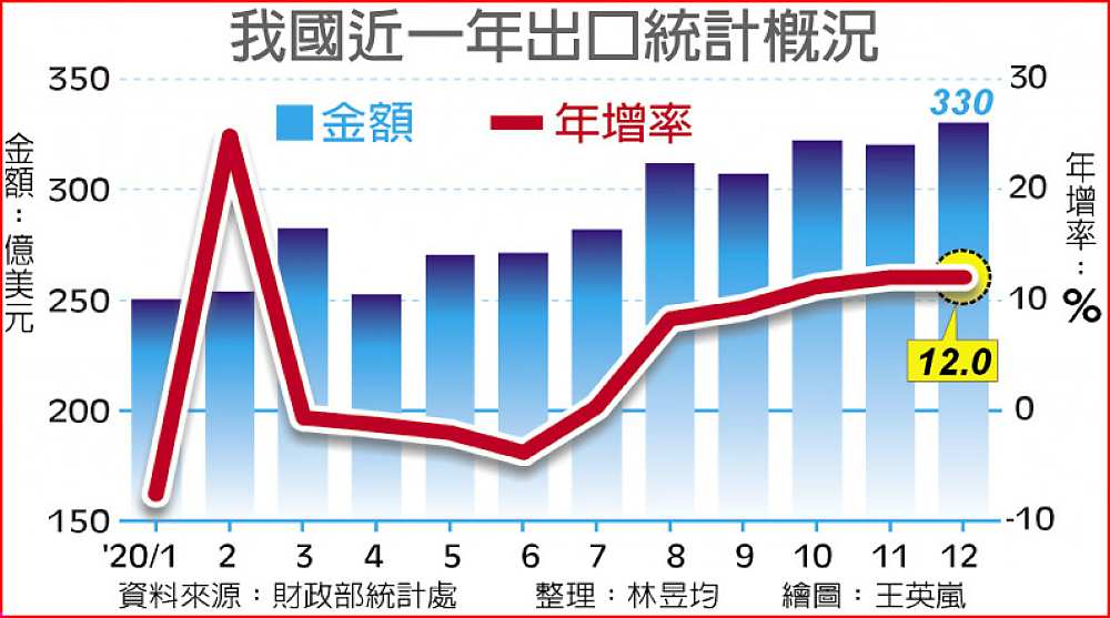 受惠蘋果新機大賣、遠距與5G商機升溫、年底採購旺季,加上傳產貨品需求回溫,我國2020年12月出口不僅連六紅、同時還締造單月330億美元、單季(第四季出口值972億美元)、單年出口(全年出口值3,453億美元)皆創新高的三大歷史高點。