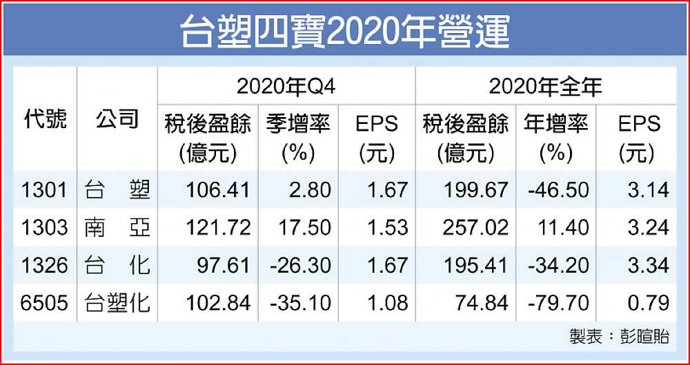 台塑、南亞2020年第四季本業獲利翻倍,分別季增162%、136%,台化季增89%,台塑化單季本業獲利也破百億元,適時彌補第三季沒有現金股息貢獻缺口,合計台塑四寶第四季本業獲利408.49億元,稅後盈餘428.58億元,單季EPS以台塑、台化1.67元並列第一,南亞、台塑化各1.53元、1.08元。2020年,台塑四寶2020年本業獲利566.35億元,稅後盈餘726.94億元。