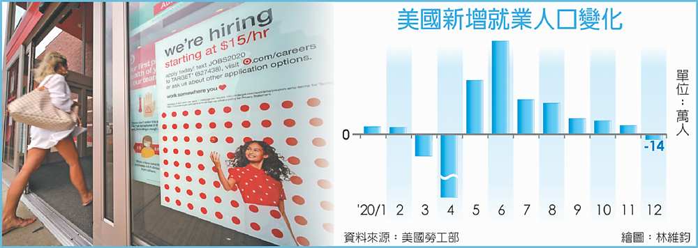 美國勞工部周五公布2020年12月就業數據較市場預期差,非農就業人數中止連續七個月增加走勢,顯示就業市場仍然疲弱。主要是嚴寒氣候、新冠肺炎疫情嚴重和防疫限制等傷害商業活動,加上政府未及時推出新振興措施,使勞動市場受衝擊。