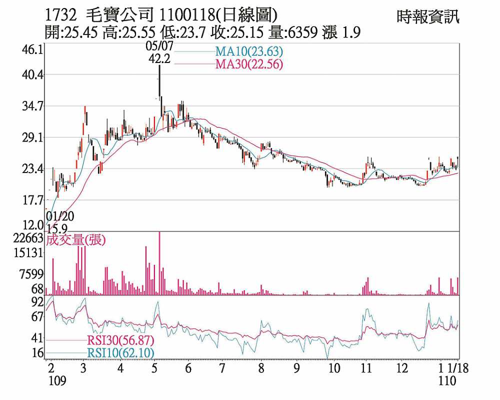 毛寶(1732)因國內疫情爆院內群聚感染,股價再度上攻,18日開盤不久即攻上漲停,高掛逾萬張買單,盤中一度打開下殺至23.7元附近,不過後續接手買盤仍強,終場收25.15元,上漲1.9元,成交6,356張,留長下影線。去年5月因疫情創下42.2元歷史高點後,隨疫情趨緩盤跌至21元附近,不過近日院內感染群聚案例增加,攻勢再起,月線支撐強勁。