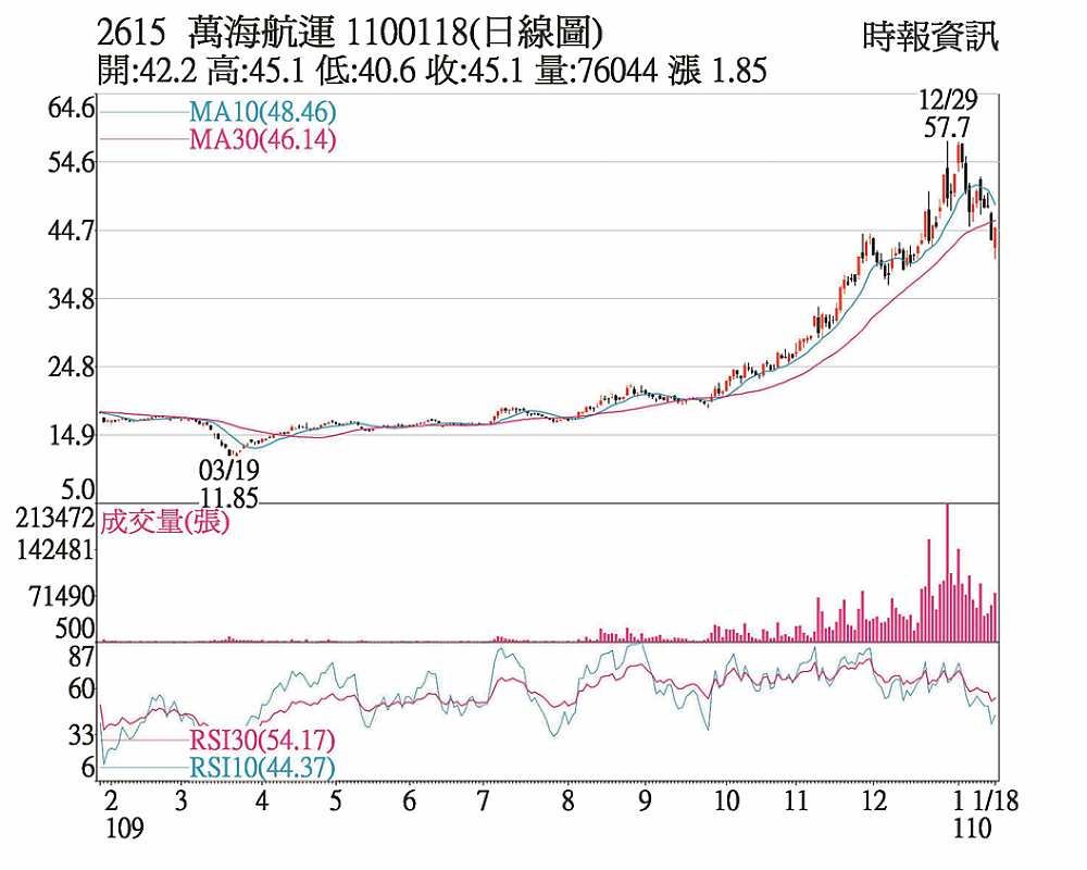 萬海(2615)18日股價開低震盪走高,終場上漲1.85元,以45.1元單日最高價作收、漲幅4.28%,成交量76,004張,其中外資買進6,113張、投信賣出1,204張、自營商小買146張。以技術面看,短線已出現較大幅度拉回修正,但多頭格局未改變,KD值在低檔向上,短線有機會跌深反彈,下檔34元具支撐。