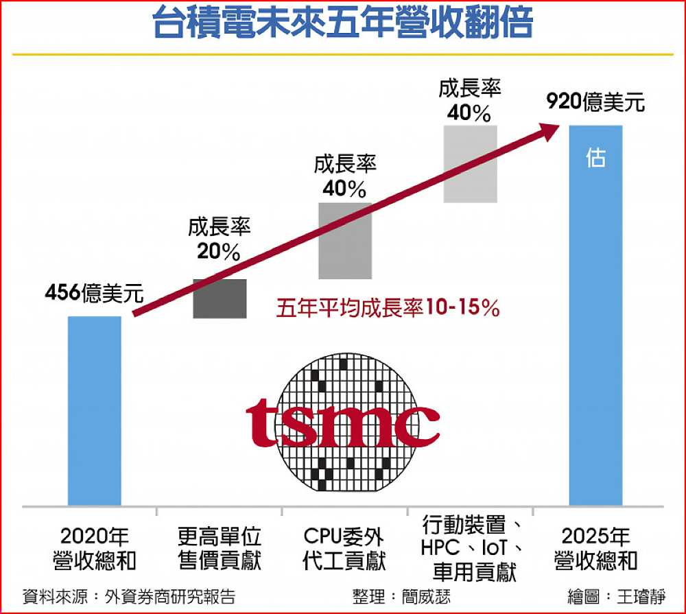 花旗環球的觀點是,有鑑於台積電猛烈調高資本支出,並將2021~2025年獲利年複合成長率目標提升到10~15%水準,考量台積電過去十年強悍的增長表現,以15%年增率來當推算基準並不為過,表示台積電營收將從2020年的456億美元,翻倍增至2025年的900億美元以上,甚至有問鼎千億元大關的可能性。(相關新聞見A3)