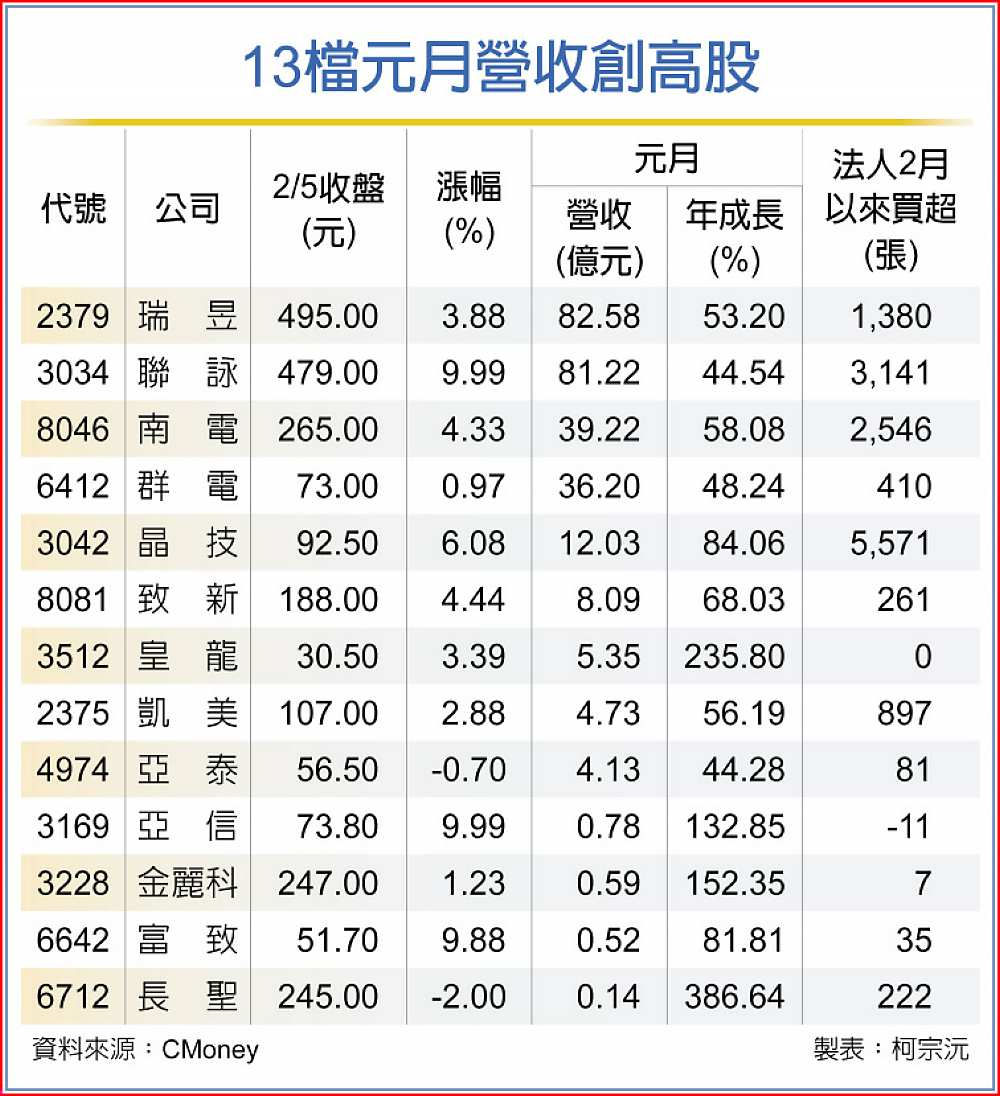 以元月營收創高股搭配技術指標篩選,瑞昱、聯詠、南電、群電、晶技、致新、皇龍、凱美、亞泰、亞信、金麗科、富致及長聖等13檔均線呈多頭排列,2月以來普遍獲法人青睞。