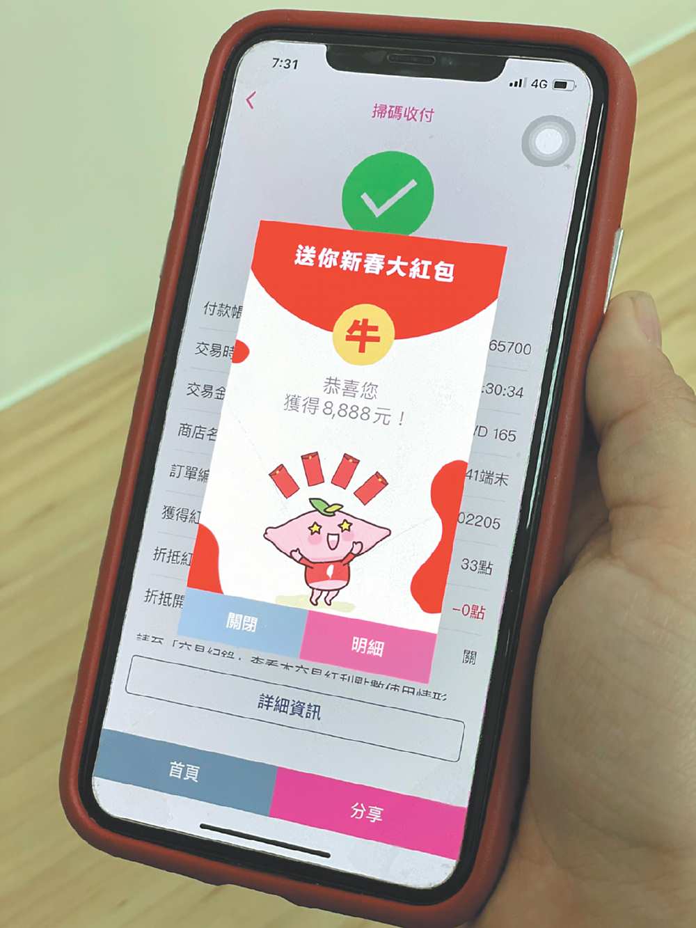 新年新氣象,台灣行動支付APP送大紅包,2月8日上午8時起至2月26日止舉辦「Happy 牛 year!送你新春大紅包」活動,凡使用台灣行動支付APP符合指定交易及金額(包含掃碼購物滿66元以上、行動轉帳888元以上、及掃碼繳費66元以上),即可於活動期間天天抽紅包,中獎金額有8,888元、888元、88元及8元等,共有約6.8萬個紅包,天天都有機會抽。