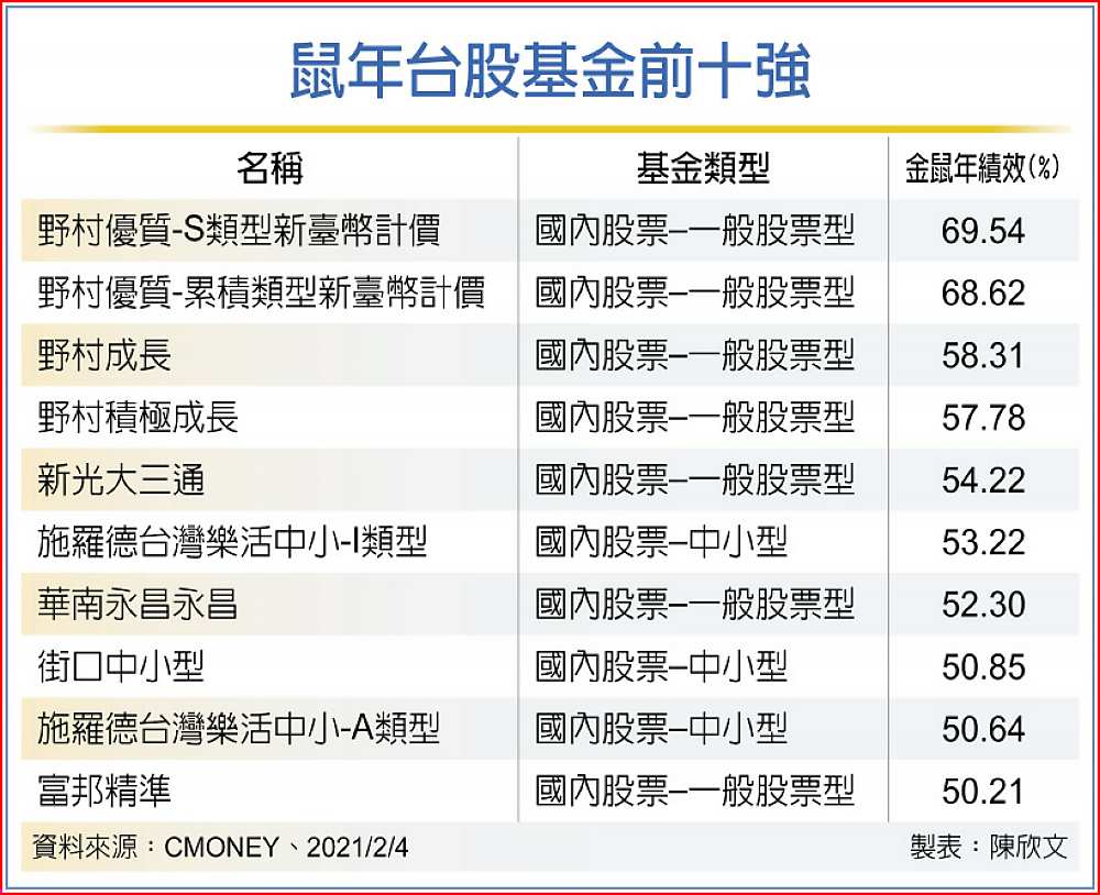 台股基金方面,野村優質基金鼠年以近七成的報酬率拿下台股基金之冠,其餘前十強的台股基金也至少有五成以上的報酬。