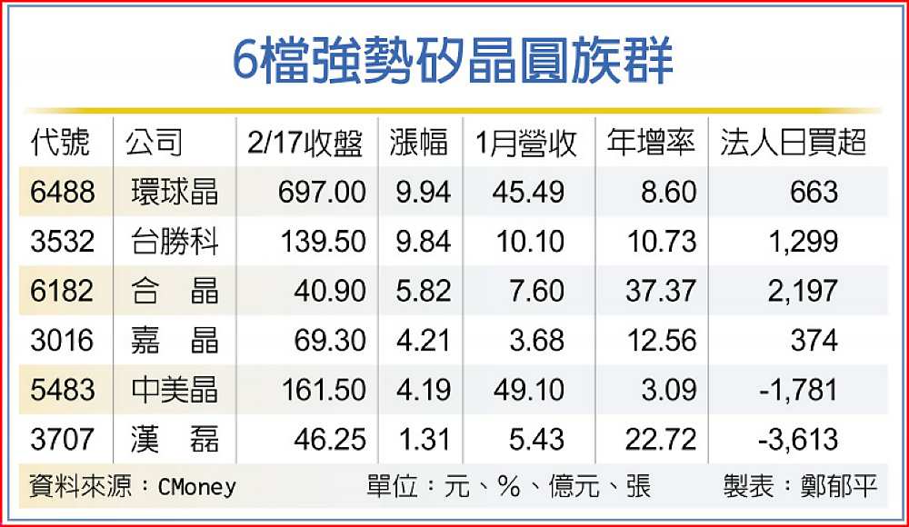 國際半導體產業協會(SEMI)旗下矽產品製造商組織(SMG)指出,去年雖受疫情、中美貿易戰衝擊,惟12吋矽晶圓需求穩定,全年矽晶圓出貨量仍正成長,出貨面積更創歷史次高,接近2018年新高紀錄。台股金牛年半導體族群股價衝衝衝,上游矽晶圓廠環球晶、台勝科強拉漲停,突破月線、5日線,合晶亦有5.82%漲幅,三大法人買超2,197張,嘉晶、中美晶亦上揚逾4%。