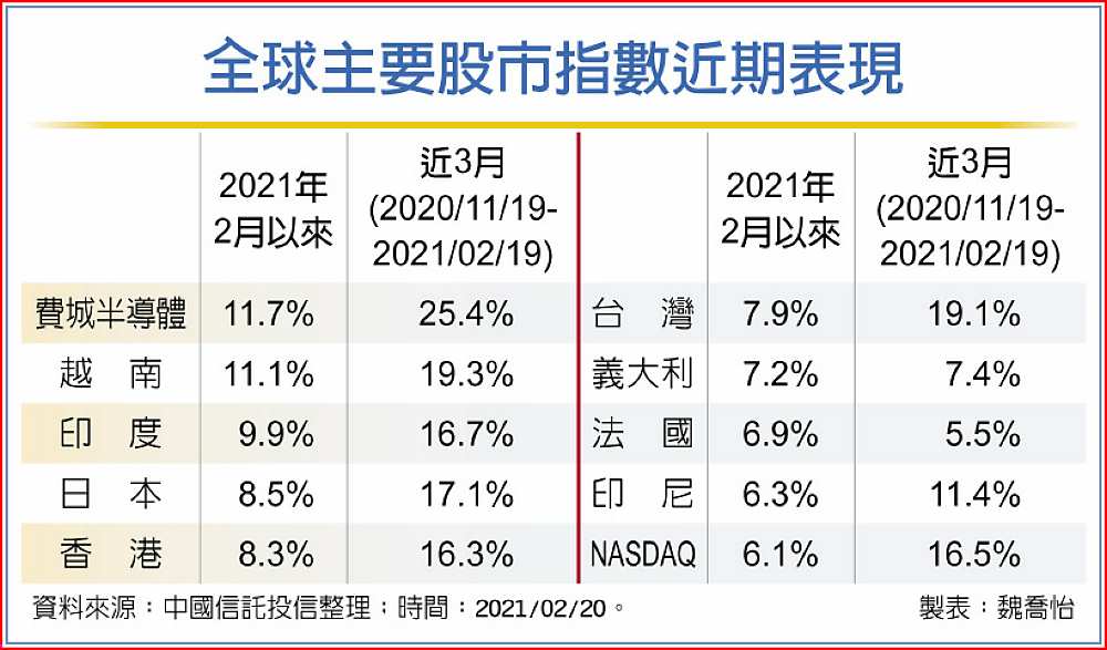 隨疫苗2月開始推行,全球經濟復甦可期,股市展望明亮,統計自2021年2月以來全球主要股市指數報酬率,越南繳出高達11.1%報酬率,為表現最搶眼的市場之一。法人建議,投資人不妨分批進場布局越南基金、東協股票基金,完整掌握越南崛起的發展潛力。