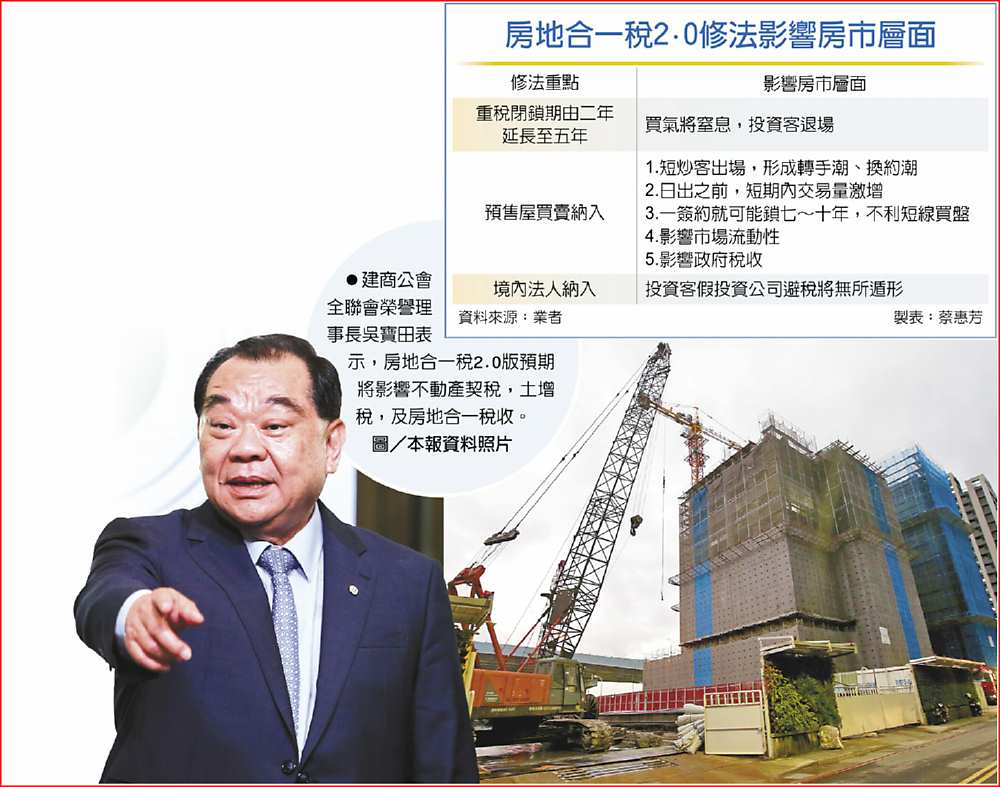 房地合一稅2.0修法影響房市層面 ●建商公會全聯會榮譽理事長吳寶田表示,房地合一稅2.0版預期將影響不動產契稅,土增稅,及房地合一稅收。圖/本報資料照片