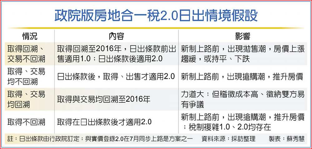至於何時起出售課2.0稅率,即所謂「日出條款」、施行日期則由行政院訂定。對於日出條款,目前財政部內部有幾個方案,但避免引起房地產市場騷動,出現大量買賣情形,財部並未對外公布。