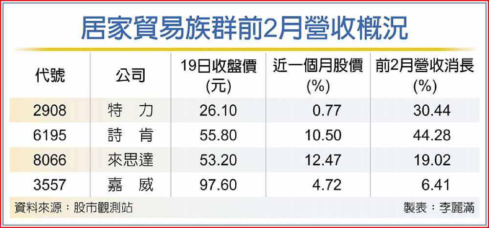 居家貿易族群後疫情時期熱度不減!受房市熱度增溫、宅經濟持續所影響,居家用品需求與訂單看增,包括特力、詩肯、來思達、嘉威生活等業者,前兩月均繳出雙位數的年增長表現,貿易訂單能見度看到上半年,儘管第二季為傳統淡季,但在積極展店與追加出貨帶動下,淡季表現一點都不淡。