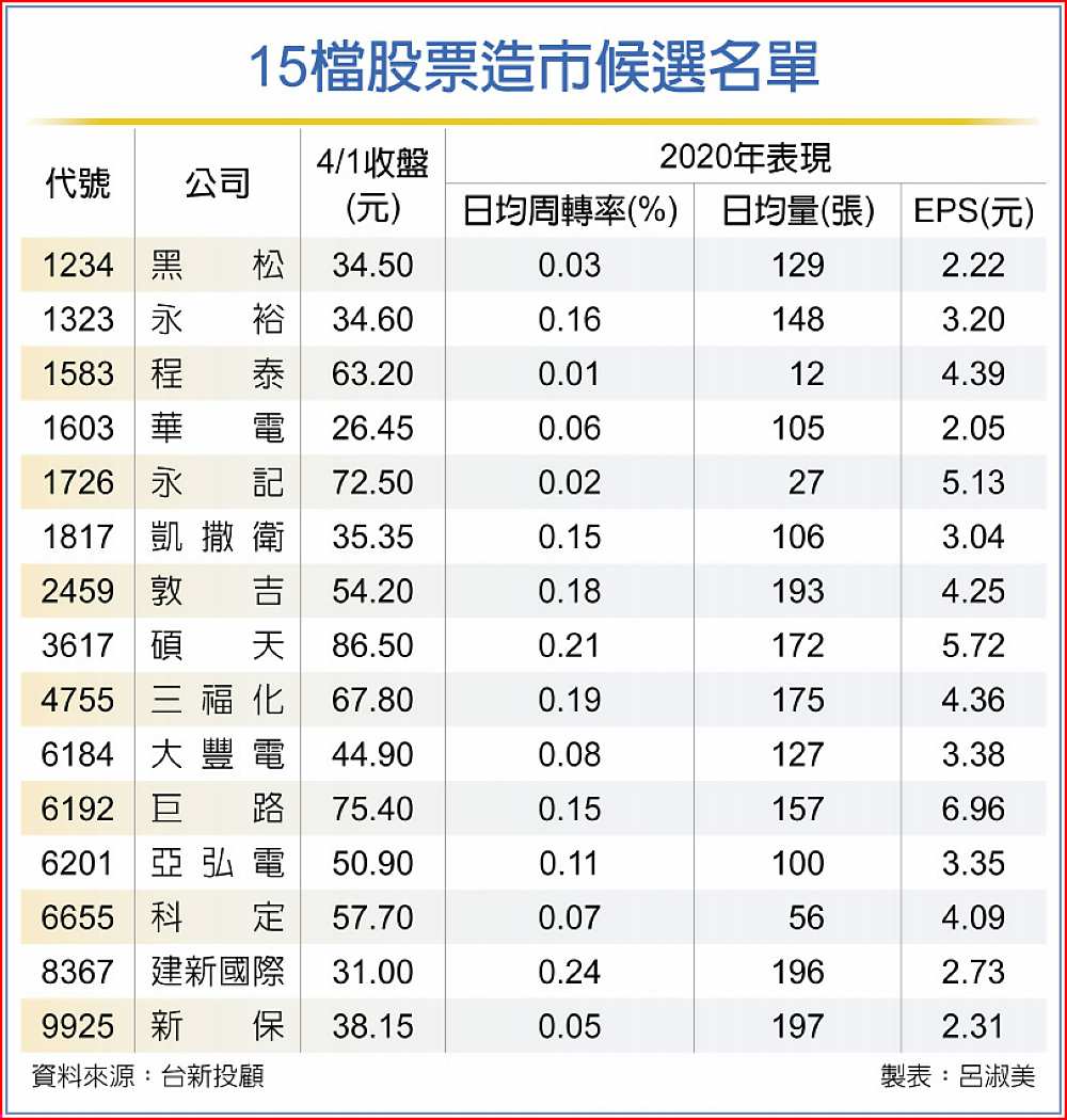 台股市場即將邁入新里程碑,股票造市制度即將於6月30日上路,隨著2020年年報出爐,相關個股輪廓即將浮現,依證交所研議相關條件篩選,許多老字號的個股均入列,進一步以股價估值相對偏低篩選,則有黑松、永裕、程泰等15檔績優股入列為候選名單,值得投資人留意,並搶先布局。
