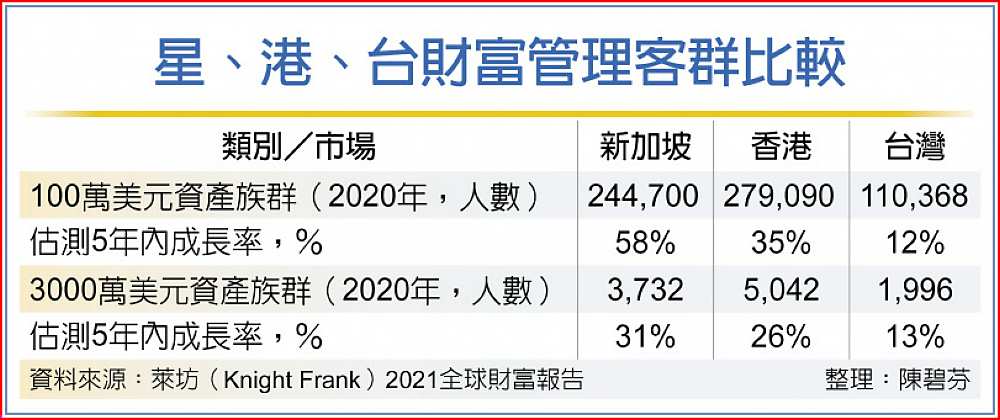 萊坊(Knight Frank)2021全球財富報告中,個人財富在100萬美元以上的台灣千萬富翁,2020年總數約11萬369位,估計5年內,在2025年可增加到12萬56位,五年內成長12%;個人資產在3,000萬美元或以上的億萬等級富翁,2020年人數1,996位,2025年可增加到2,248位,五年內成長13%。香港則是千萬富翁人數可在5年內從27萬9千位,增加至37萬5千多位,五年內成長35%,億萬富金翁則會從5,042位增加到6,341位,五年內成長26%。