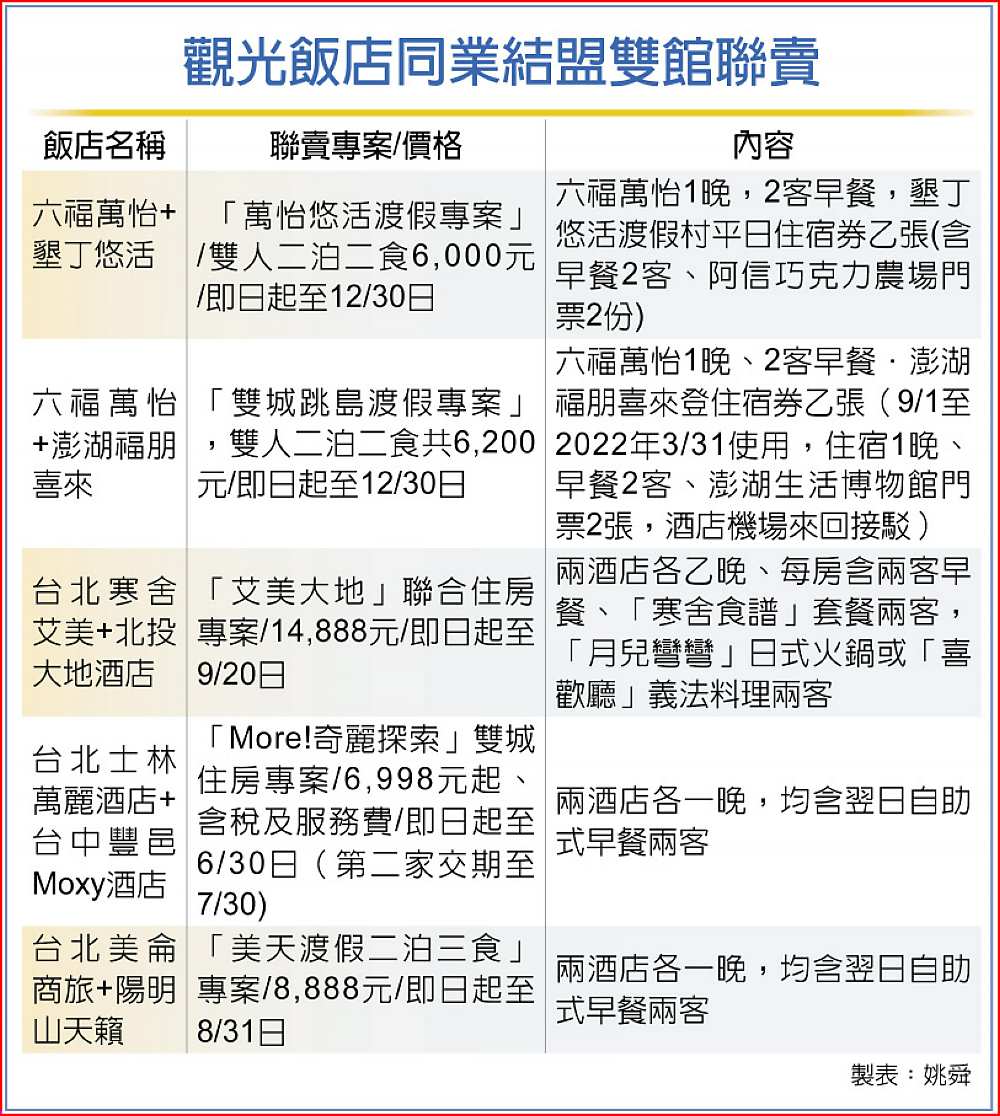 台北六福萬怡酒店本季一口氣攜手墾丁悠活與澎湖福朋喜來登,推出兩套雙館聯賣專房專案,並一路推至12月30日。台北寒舍艾美則攜手北投大地酒店,即日起至9月20日推出「艾美 大地」聯合住房專案。台北美侖商旅攜手陽明山天籟酒店,在8月底前推出「美天渡假二泊三食」專案,台北士林萬麗酒店則攜手台中豐邑Moxy酒店推出雙館雙城住房專案,期能結合彼此優勢資源擴大集客效益。