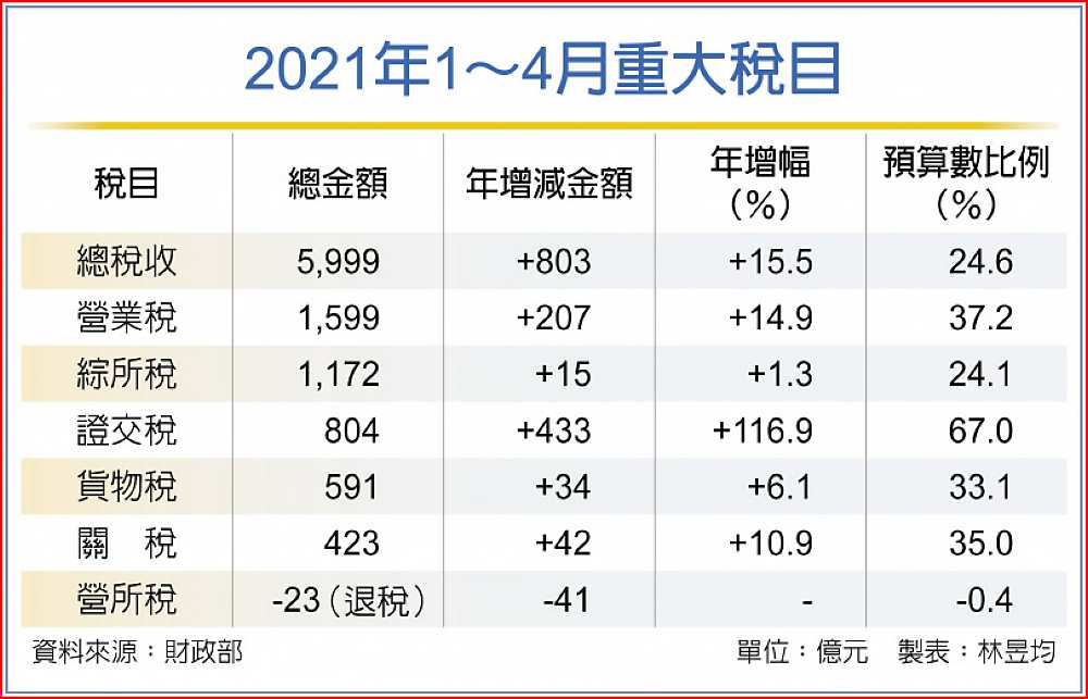 我國產銷活動升溫、房市交易熱絡,還有遺產稅有大額案件入帳,前四月包括證交稅、營業稅(1,599億元)、關稅(423億元)、綜所稅(1,172億元)、契稅(56億元)、菸酒稅(220億元)、遺產稅(103億元)等稅額都創下歷年同期最高。