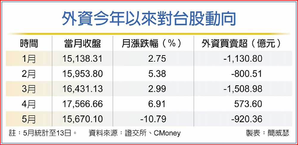 外資13日延續近期賣超台股慣性,單日賣超226億元,為連續第四個交易日賣超,5月以來賣超金額直逼千億元大關,籌碼壓力未除。法人指出,外資現階段的出脫主要考量美股拉回、台股氣氛受疫情影響兩大理由,不確定性告終後,才可能出現較大規模的資金回頭潮。