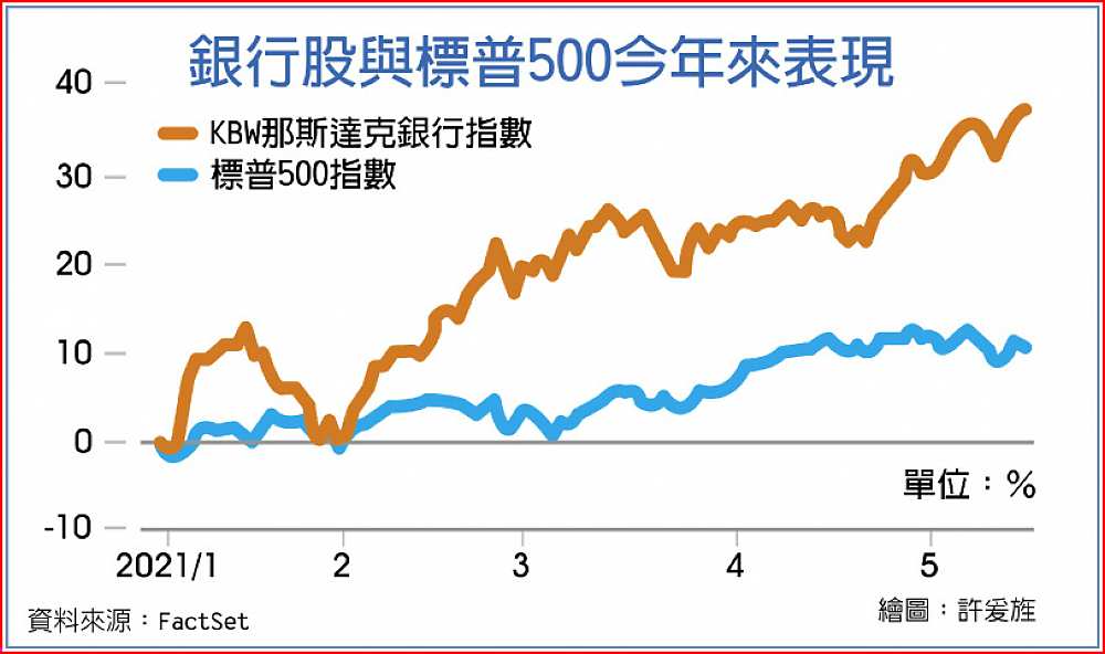 追蹤美國大型銀行類股的KBW那斯達克銀行指數,2021年迄今大漲37%,同期標普500指數漲幅為11%。前者在2020年下挫將近14%,反觀標普500指數同期揚升逾16%。2021年小型區域銀行股價漲勢更強勁,KBW那斯達克區域銀行指數升幅達38%。