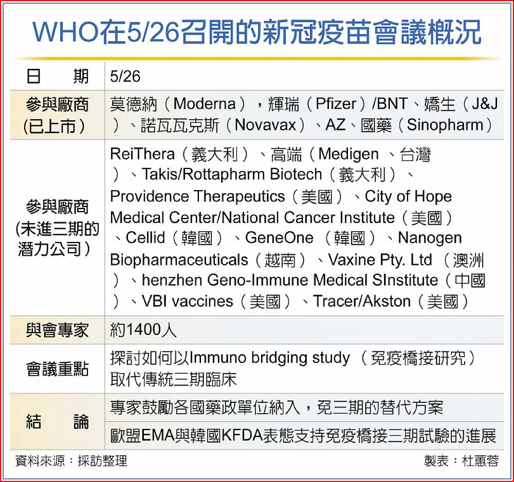 有鑑於全球新冠疫情持續嚴峻,加上目前疫苗產能供不應求,針對未來新冠疫苗的三期試驗設計,WHO於5月26日召開的專家視訊會議中提出「免三期的替代方案」新指引,會中歐盟EMA與韓國KFDA已表態支持;業界認為,此舉將加速國產疫苗的國際認證,前進全球打世界盃。