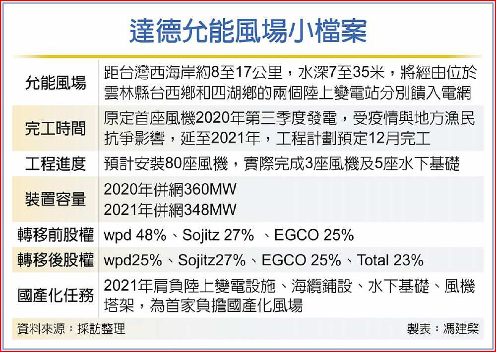 達德能源(wpd)旗下允能風場傳財務危機,急向經濟部申請引進新投資股東,補足財務缺口。經濟部1日證實,因達德集團母公司受財務能力限制,無法注資允能風場,引發允能有破產之虞,基於允能已進入海上施工階段,及公共利益、社會影響等綜合考量,最終有條件同意引進新投資人,未來達德集團在允能風場股權將降至25%。