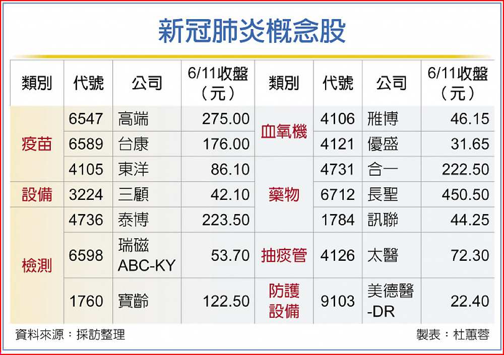 疫情延燒擴大快篩檢測需求,加上高端新冠疫苗二期臨床試驗解盲成功,推升檢測試劑、治療性醫材、防疫口罩等成長力道,新冠肺炎概念股多頭趁勢而起,高端之外,泰博、寶齡、三顧、逸達、雃博等個股成為領軍新指標。
