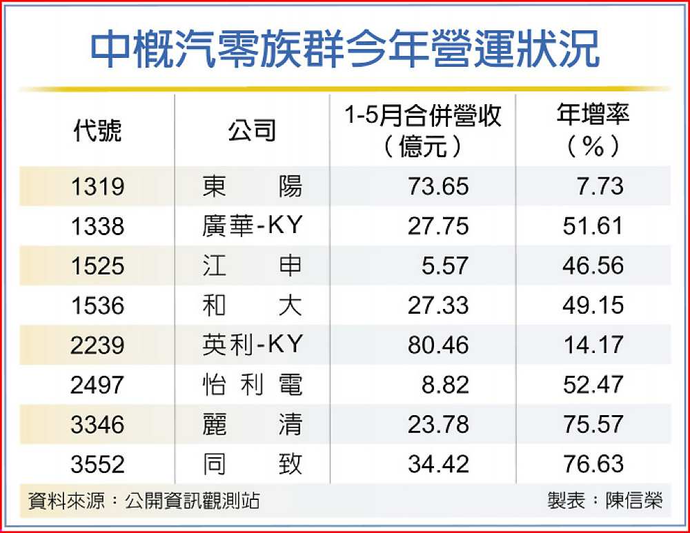 法人點出,包括東陽(1319)、廣華-KY(1338)、江申(1525)、和大(1536)、英利-KY(2239)、怡利電(2497)、麗清(3346)、同致(3552)等布局大陸市場的台資汽車零件廠,第三季業績將受惠。