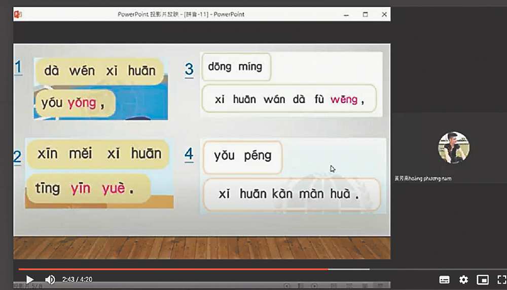 她表示,華語老師在上課期間,準時上課點名,也記錄每位學生的出缺席狀況。在線上課程中,華語老師也會利用網路學習平台,使用多種教學模式和教學APP,讓另一端的學生們,能感受到不同的教學模式,並達到聽說讀寫同時進行的理想模式。