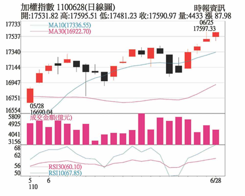 28日指數盤中高點17,595點,距離上周五(25日)的高點17,597點,指數只差距2點就要再創近期新高,而離4月29日的前波高點17,709點僅差距112點,以目前市場氣氛來看,收盤漲停家數中集中市場佔40檔,櫃買市場約33檔,整體漲停家數高達77檔,顯示市場投資氣氛佳,指數預期有機會再過4月下旬的新高,但在量能已經連續三天均無法突破5日均線,整體追價量能無法放大下,KD、RSI指標也沒有過高,與指數產生二度背離,後續創高後的風險逐漸增加。