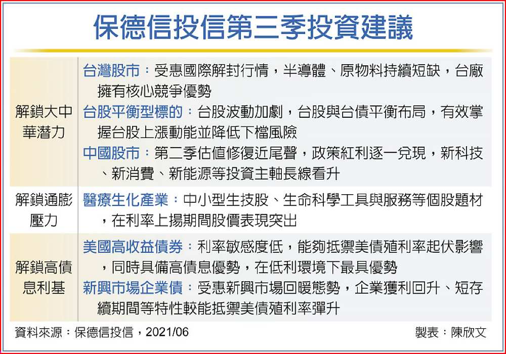 針對第三季股市投資,建議投資人不妨鎖定大中華的投資潛力、通膨下評價具有優勢的醫療生技類股以及因應通膨及QE縮表議題縮短縮短債券部位的存續期間,首選具有高殖利率特色的美國高收益債等三大方向布局。