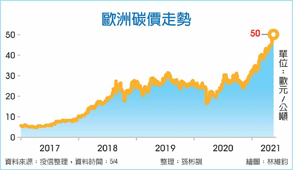 歐盟碳價在今年5月首度超過每公噸50歐元。碳價在近幾個月急遽上升,目前的碳價已是疫情前水準的兩倍之多。在碳價影響企業成本的情況下,未來的投資趨勢將聚焦在零碳排、低碳排企業。