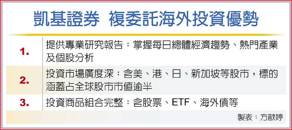 凱基證券提醒,儘管複委託平台的選擇眾多,建議投資人透過國內券商的複委託業務來參與投資海外市場是更為妥當的方式。凱基證券的客戶在申請凱基投顧會員資格後,可觀看其所發布的研究報告,除了有對總體經濟事件的相關評論外,更提供主要熱門產業及個股等報告,如近期最具話題的半導體設備、電子商務及數位產業等。專業的研究報告有助於投資人尋找投資標的時,更容易掌握市場焦點,達事半功倍之效。