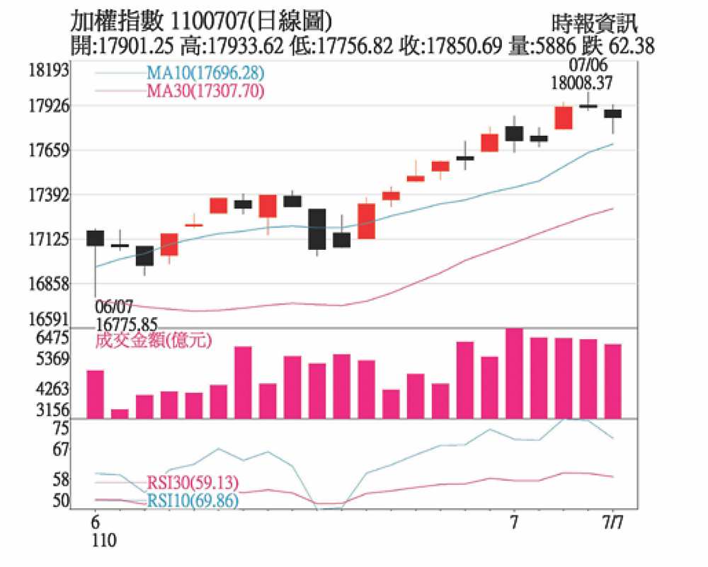 現階段可觀察指數兩個關鍵位置,其一是本周一大漲的紅K低檔17,783點,其二是前波的歷史高檔17,709點,只要這兩處成功防守,就確立短線買盤仍強,指數將可延續震盪偏多的態勢,但如果這兩道支撐遭到跌破,則先前的支撐易轉為壓力,盤勢恐將轉趨震盪整理,屆時就須多加留意。