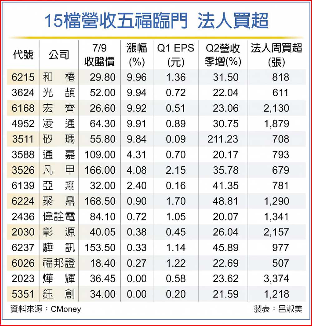 上市櫃公司6月、第二季及累計上半年營收即將於今(12)日截止公告,投資專家指出,第1季每股獲利(EPS)優,且第二季營收季增二成以上,獲利有望傳捷報,篩選和椿(6215)、光頡(3624)等15檔6月營收「五福臨門」股,不但獲得法人上周買超,股價表現紅不讓。