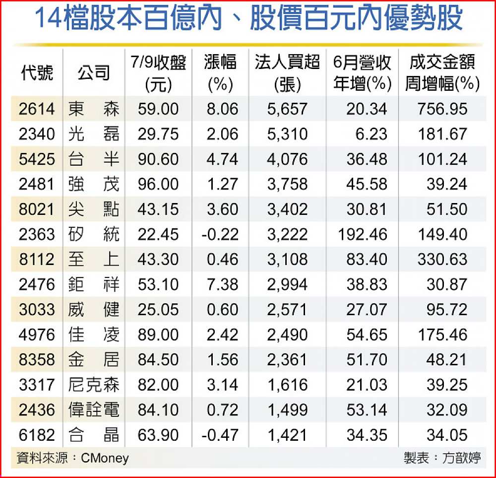在股本百億元以下、股價百元以內的個股中,搭配6月營收年成長,且成交金額較前一周增加,法人9日單日也買超等條件篩選,有包括東森、光磊、台半、強茂、尖點、矽統、至上、鉅祥、威健、佳凌、金居、尼克森、偉詮電、合晶等14檔個股出線;明顯以電子族群、特別是半導體為大宗。