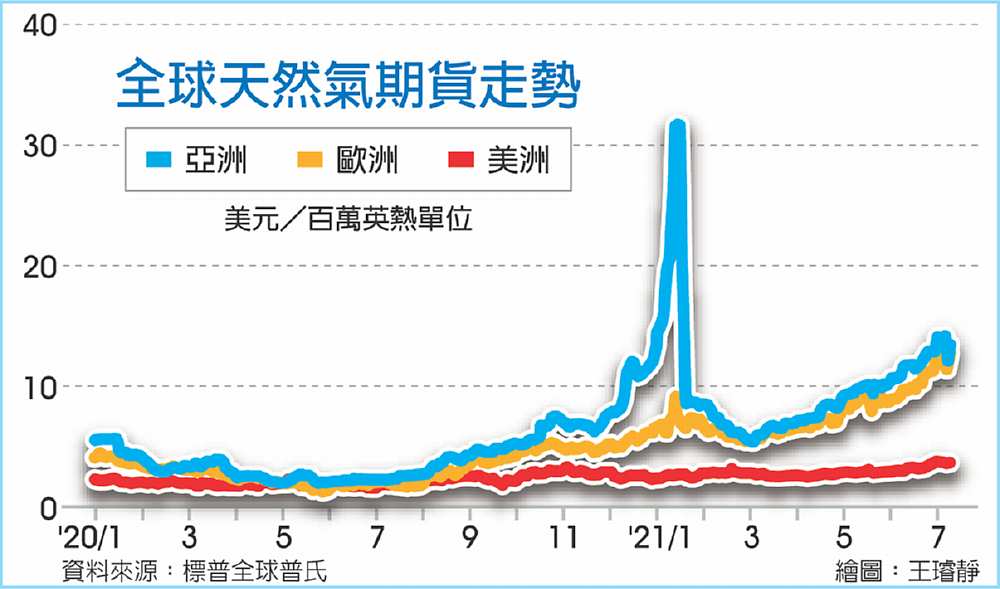 美國西北與加拿大西南的太平洋沿岸地區,遭受前未所見的熱浪衝擊,巴西嚴重乾旱令天然氣發電需求上升,中國能源需求也暴增,讓天然氣供應更緊張,刺激天然氣價格創新高並衝擊能源市場。