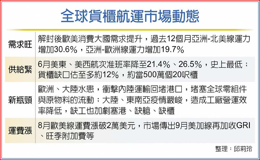 兩大航運新危機加劇供應鏈瓶頸,帶動8月歐美線運費漲破2萬美元天價,市場傳出9月將再加收旺季附加費等。一方面,由於歐洲、大陸水患,衝擊內陸運輸一路回堵到港口,堵塞了全球零組件與原物料的流動。另一方面,大陸、東南亞疫情嚴峻,造成工廠營運效率降低,缺工也造成塞港、缺艙、缺櫃,在來自歐美旺季、年終節慶商品需求遠大於供給下,高運價可望延續。
