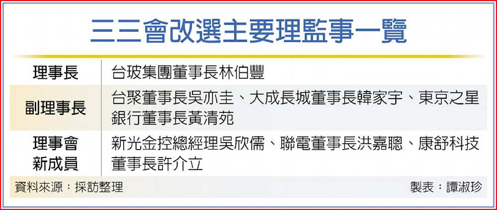 林伯豐接掌後的三三會,除吳亦圭、韓家宇仍續任副會長,黃清苑雖因是「知日派」被委以重任,但他同時是金融業界的代表,顯示了新一屆理監事會的多元布局。